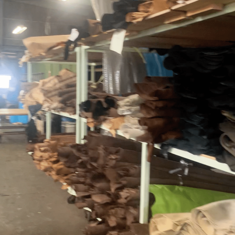 まず目に入ったのは、想像をはるかに超える量の革でした。とにかく種類がすごい。また工場の中では、人の感覚によって絶妙に調合された塗料で革をカラーリングする様子も見せてもらいました。