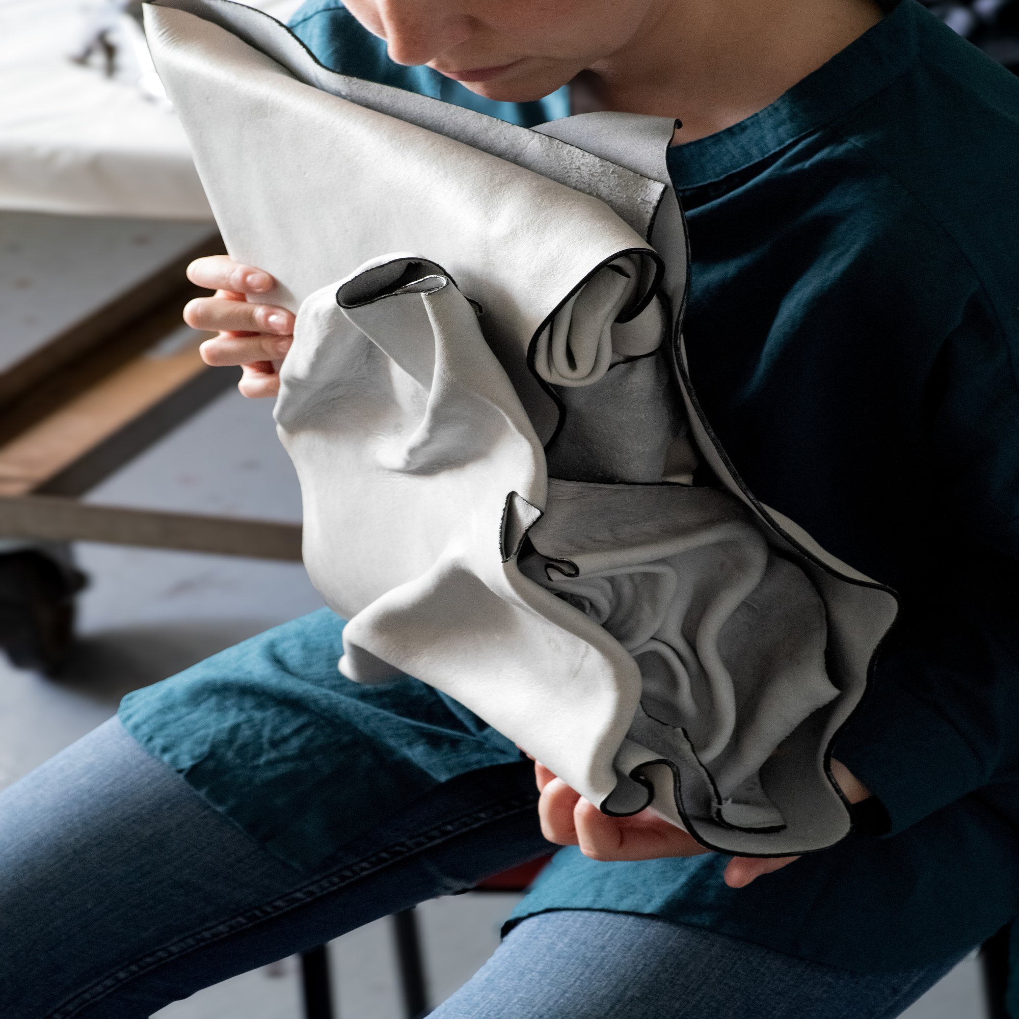 立体的なフォルムは馬の鞍からの着想によるもので、抽象的な形からシルエットを起こしていく過程も印象的でした。こうやってイメージ作るんだな、って間近でデザイナーの仕事を見られる機会なんてなかったので、とても新鮮。